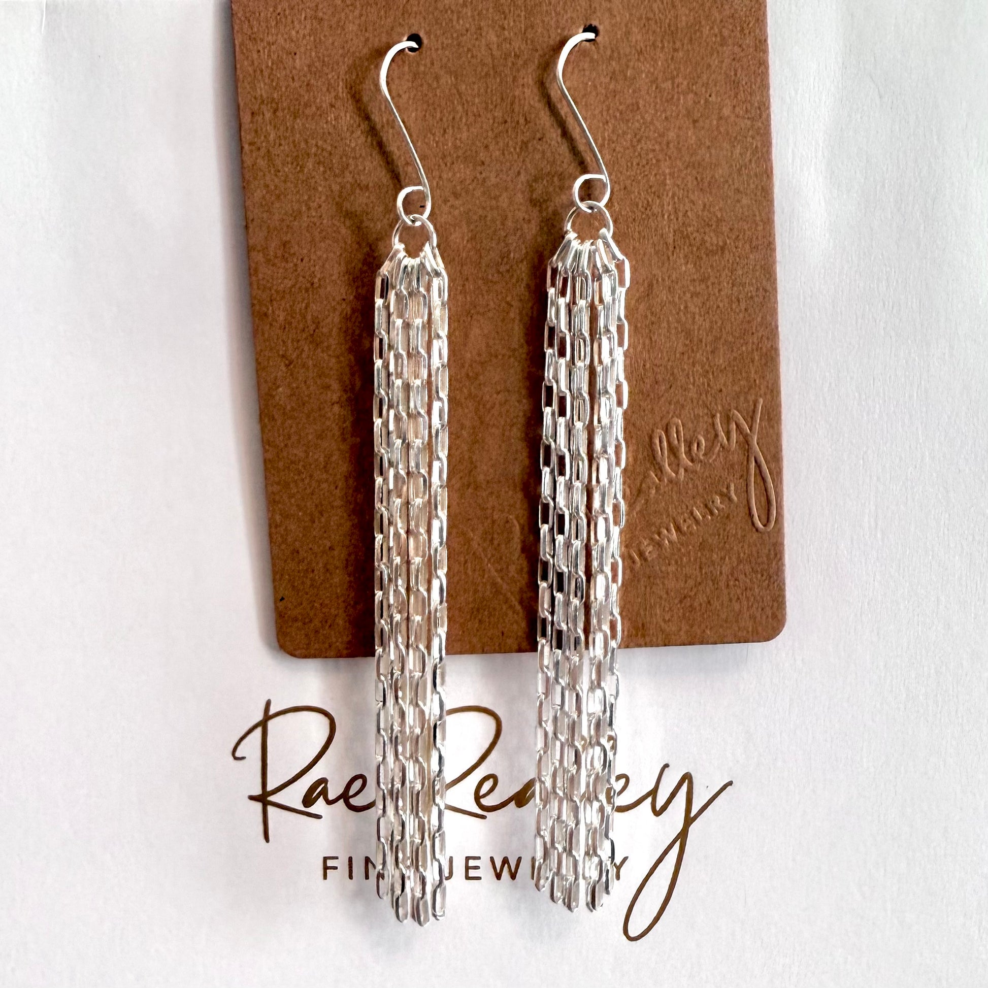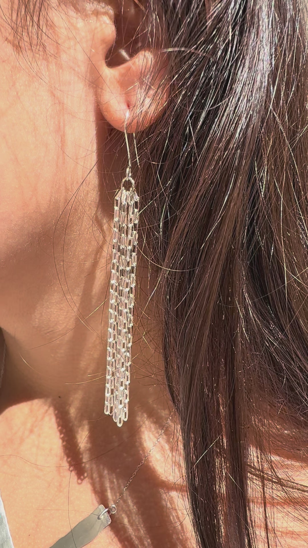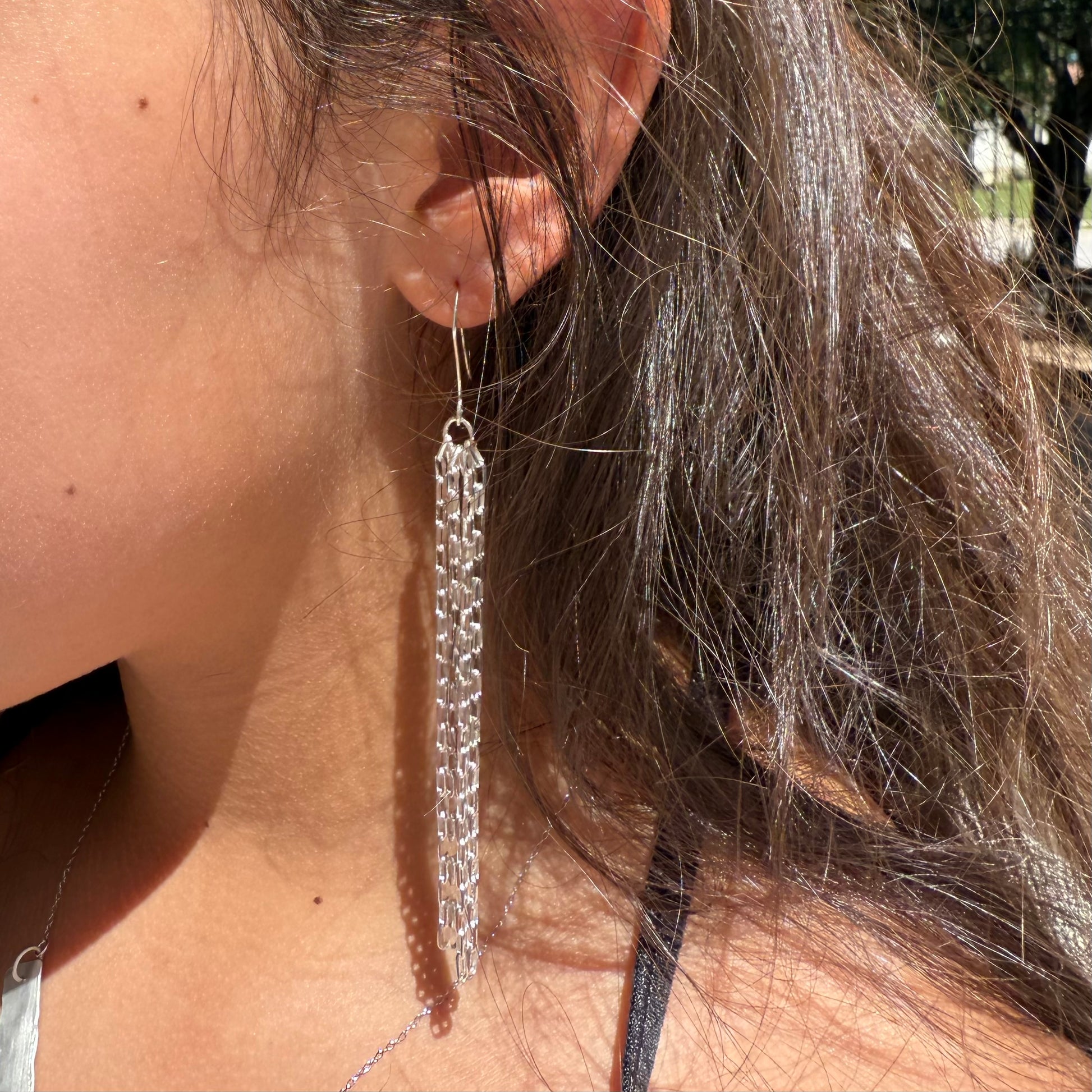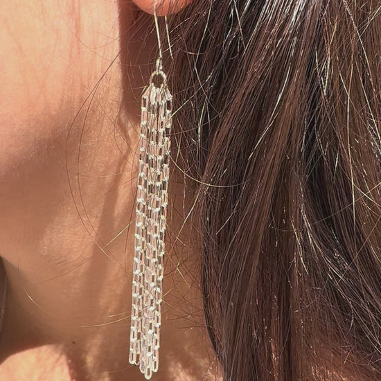 These show-stopping statement earrings feature a modern design that creates mesmerizing movement and catches light from every angle. Each earring showcases multiple strands of delicate sterling silver chain that flow gracefully, creating a luxurious waterfall effect that moves beautifully with the wearer.
