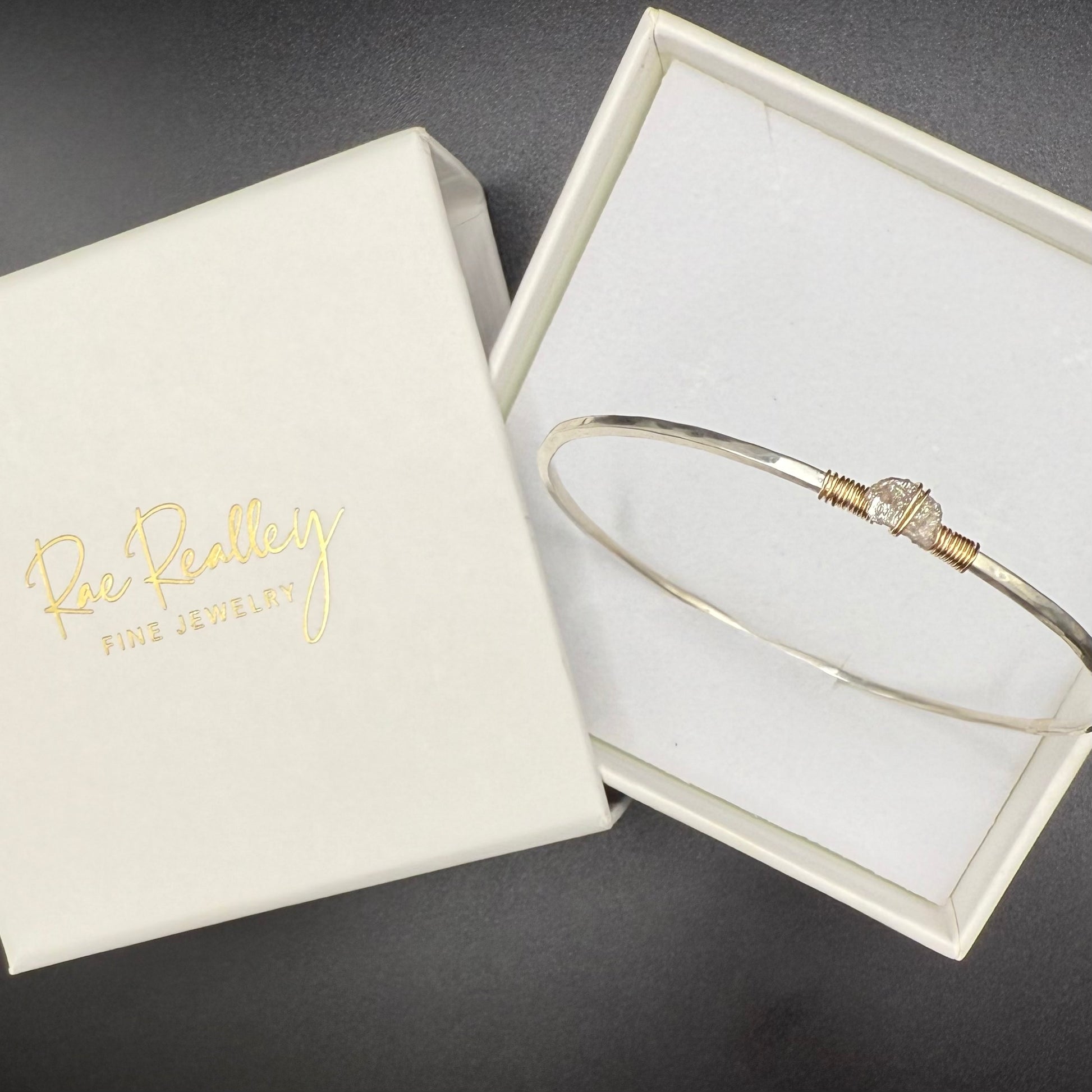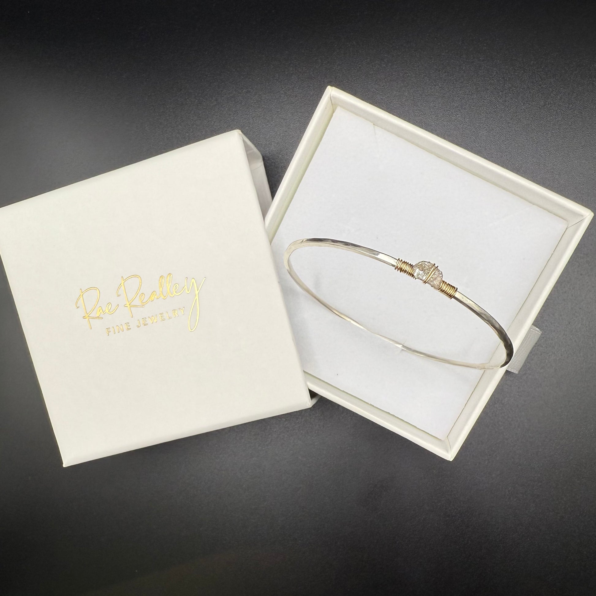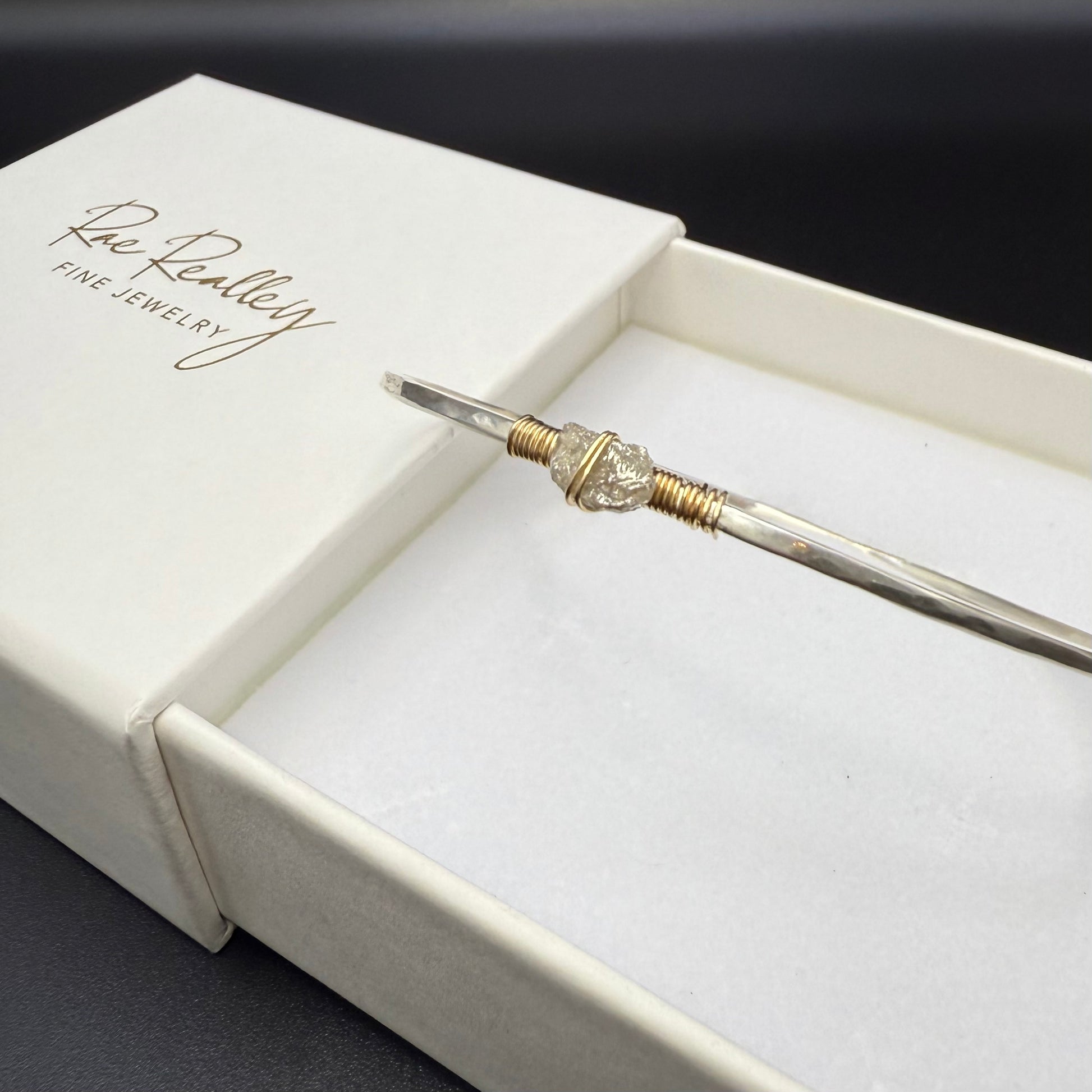 This elegant and sophisticated bangle bracelet showcases the perfect harmony of refined craftsmanship and raw natural beauty. Crafted from premium sterling silver with a distinctive hammered finish, this sleek bangle features a stunning 1-carat uncut gray diamond secured with luxurious gold wire wrapping that adds warmth and visual interest to the cool silver tones.