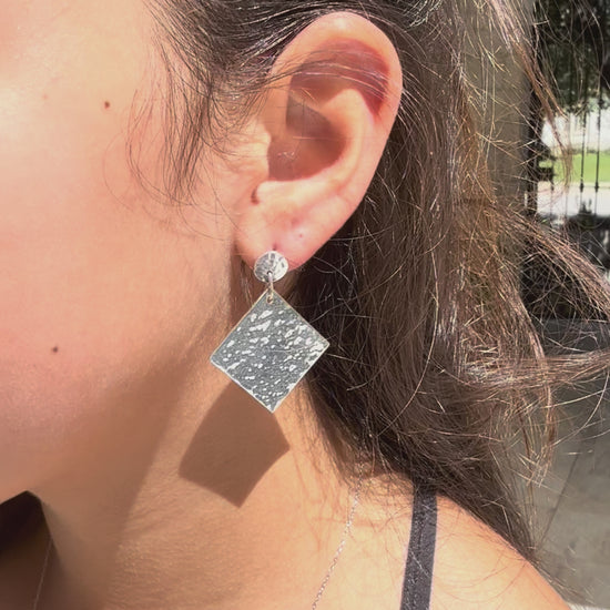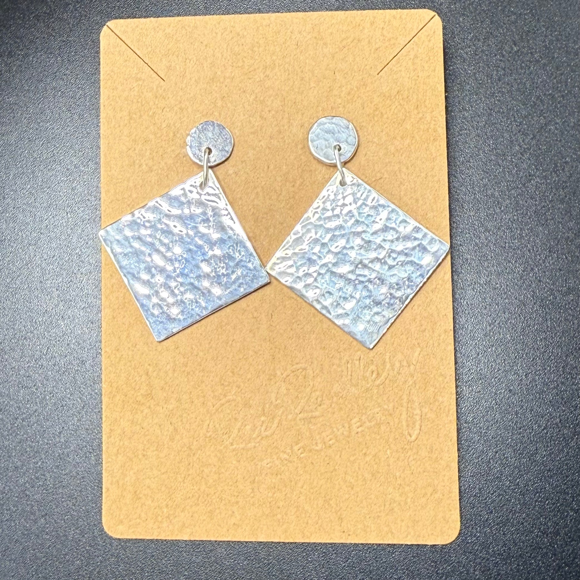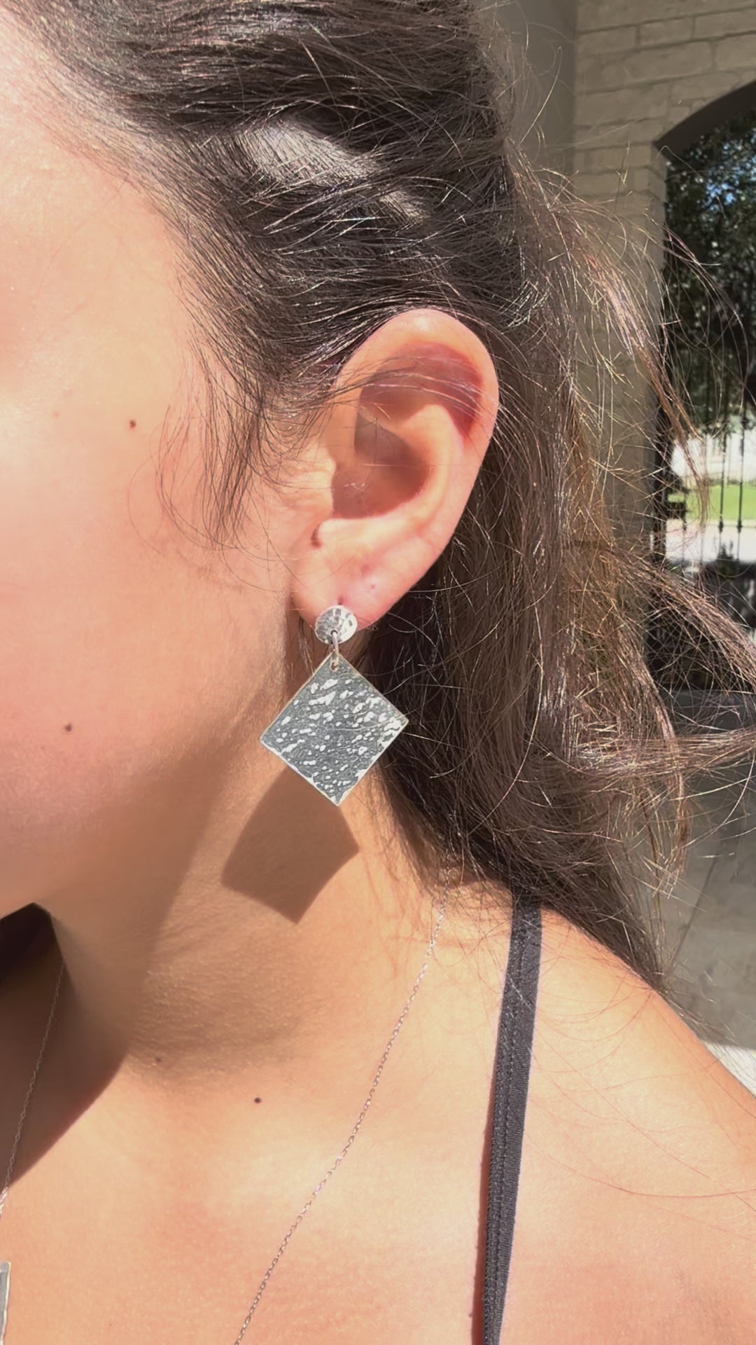 These bold, contemporary earrings showcase the beauty of artisan metalwork with their distinctive hand-hammered texture and modern geometric design. Each earring features a substantial square pendant crafted from premium sterling silver, displaying a captivating hammered surface that creates depth, dimension, and brilliant light reflection.