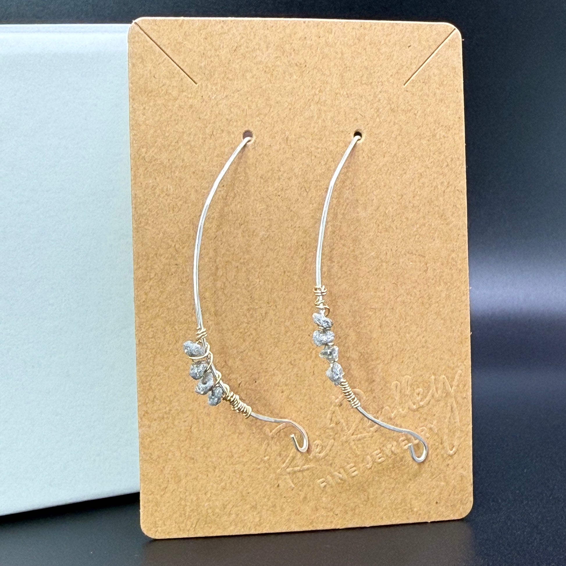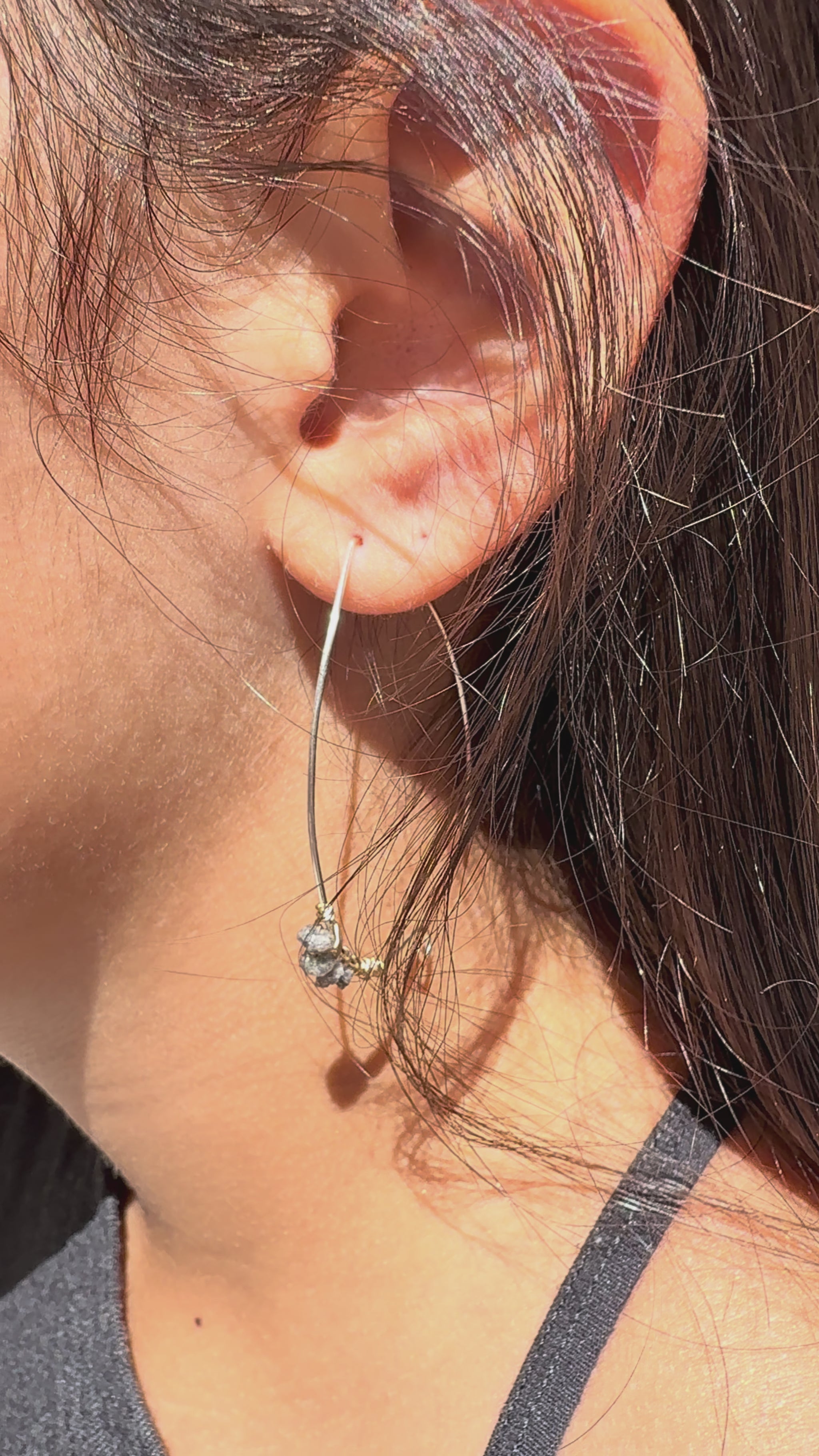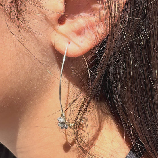 These graceful, feather-light earrings showcase the perfect blend of contemporary design and raw natural beauty. Each earring features a sleek sterling silver curved wire that flows elegantly from the ear, creating a modern, minimalist silhouette that moves beautifully with the wearer.