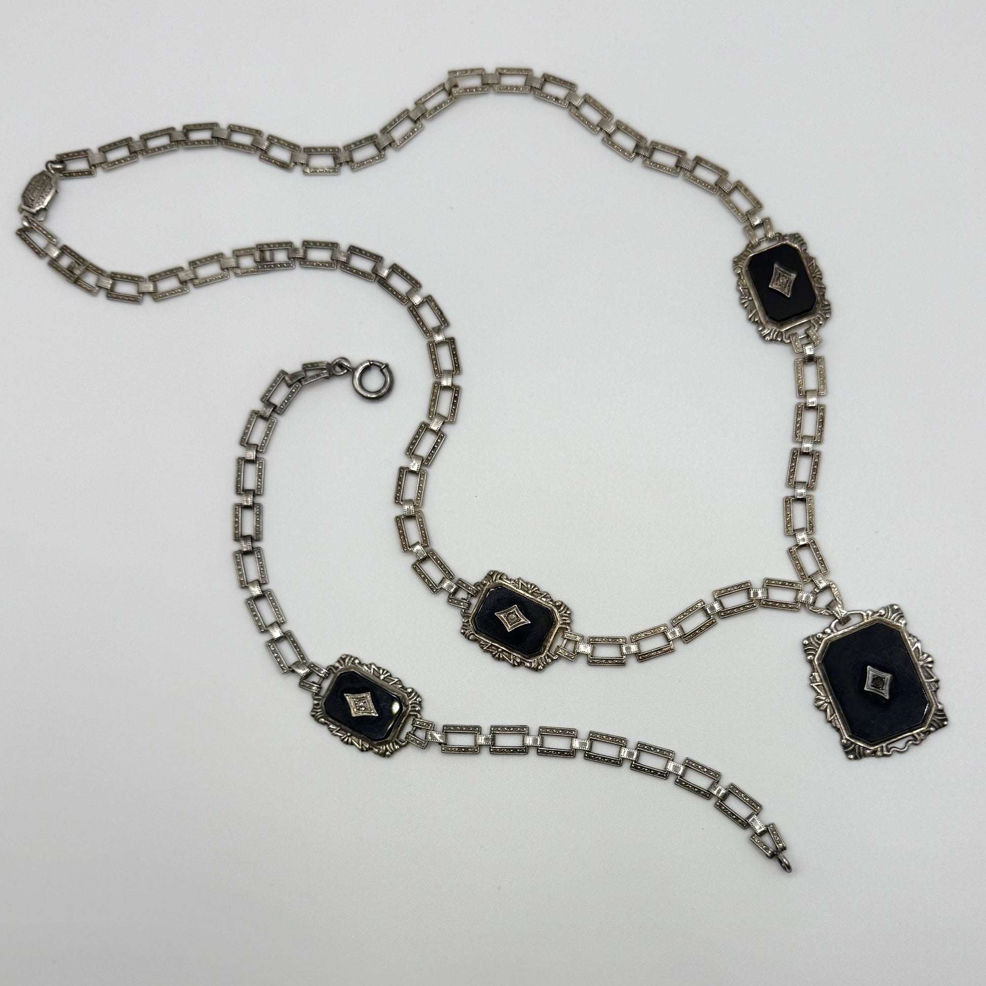 This rare matched set exemplifies the sophisticated craftsmanship of 1920s fine jewelry. The striking contrast of lustrous black onyx against bright sterling silver, accented with sparkling diamonds, creates a timeless look perfect for collectors of Art Deco jewelry, vintage enthusiasts, or anyone seeking a unique heirloom-quality statement piece.