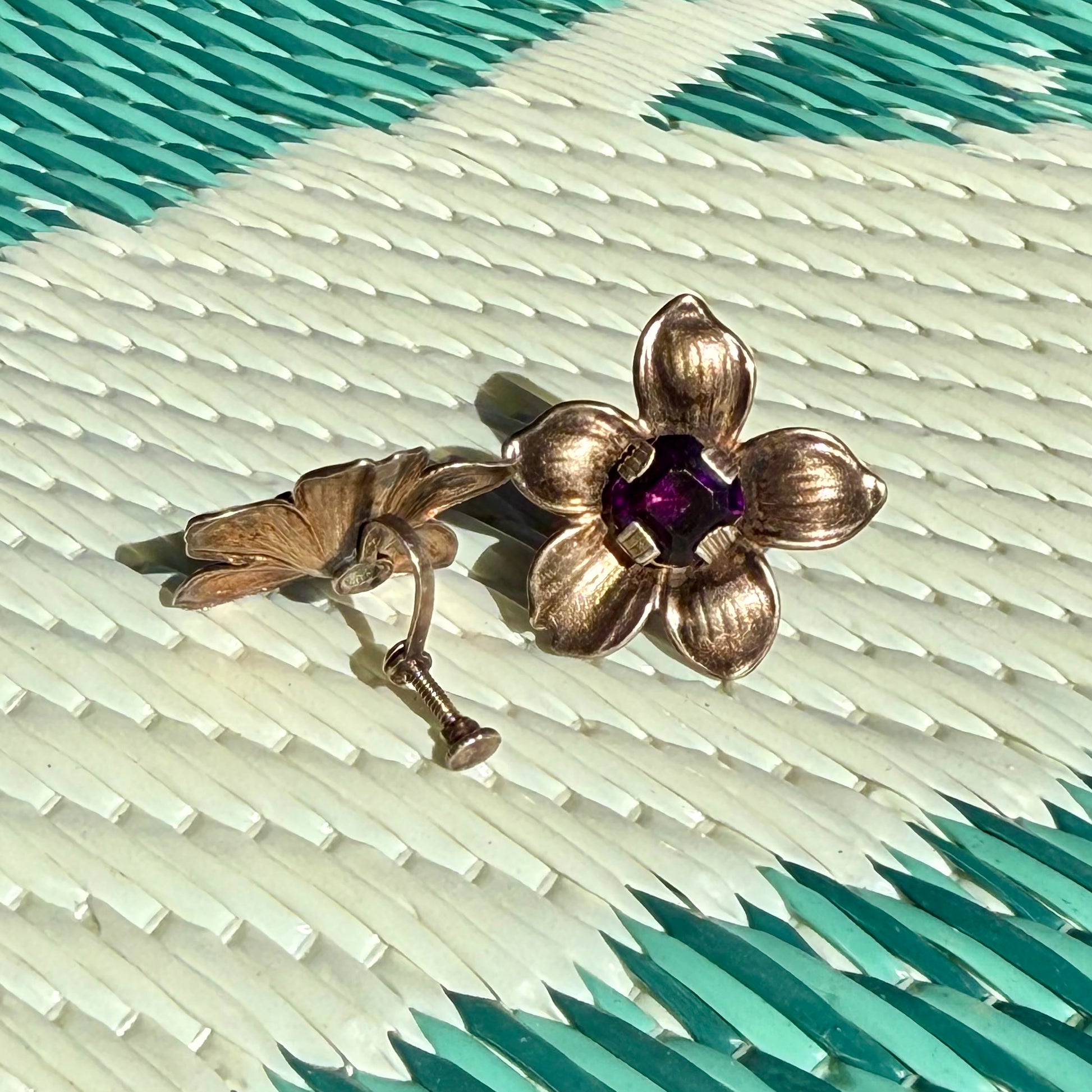 These charming floral earrings exemplify 1940s retro glamour with their naturalistic flower motif and warm gold tones. The combination of gold vermeil and vibrant amethyst creates a luxurious look that transitions beautifully from day to evening. The screw-back mechanism ensures security while maintaining period authenticity.