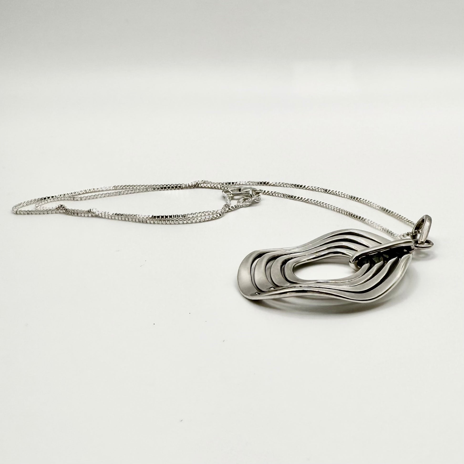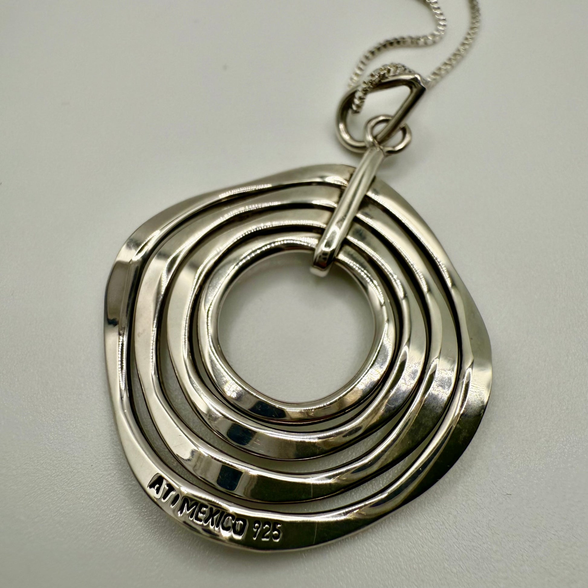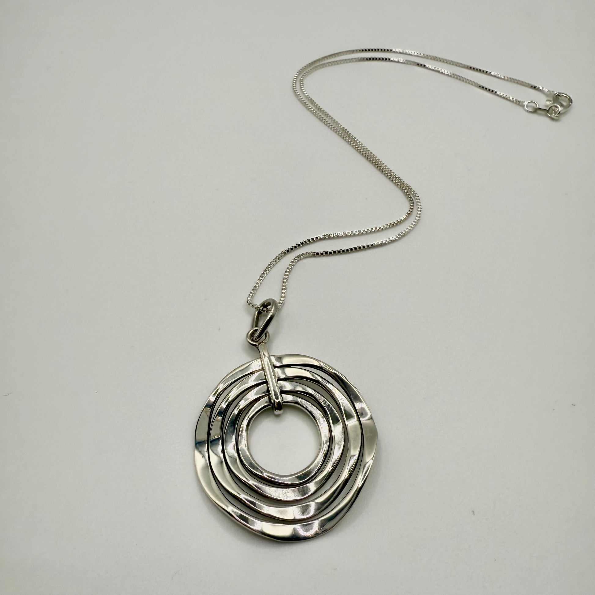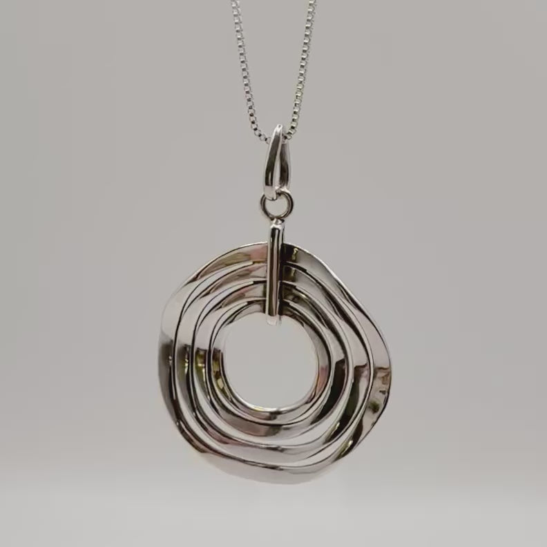 A statement piece from the 1990s, this sterling silver necklace showcases sophisticated geometric design with timeless appeal. The pendant features four concentric circles in a dynamic spiral formation, creating beautiful depth and movement as it catches the light.