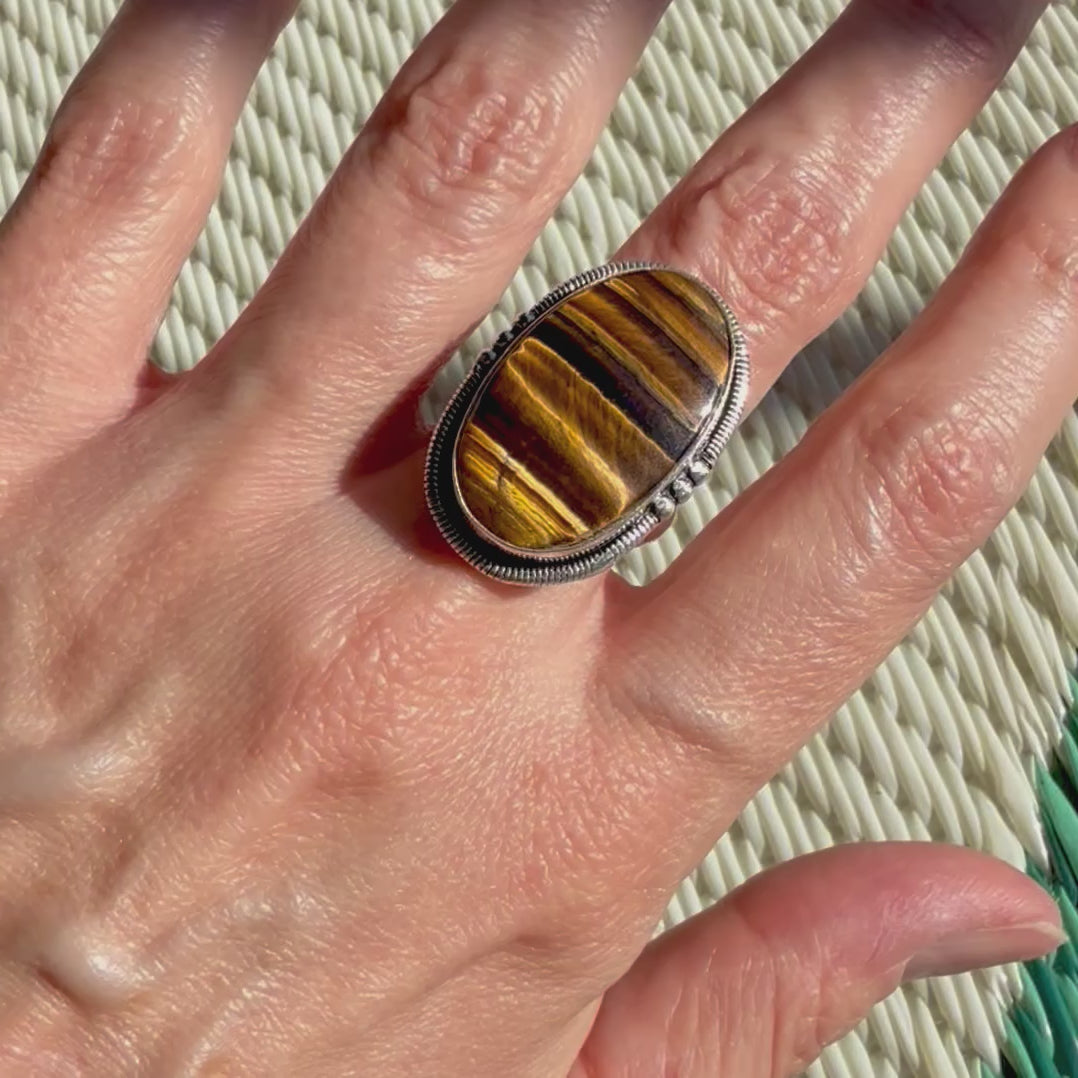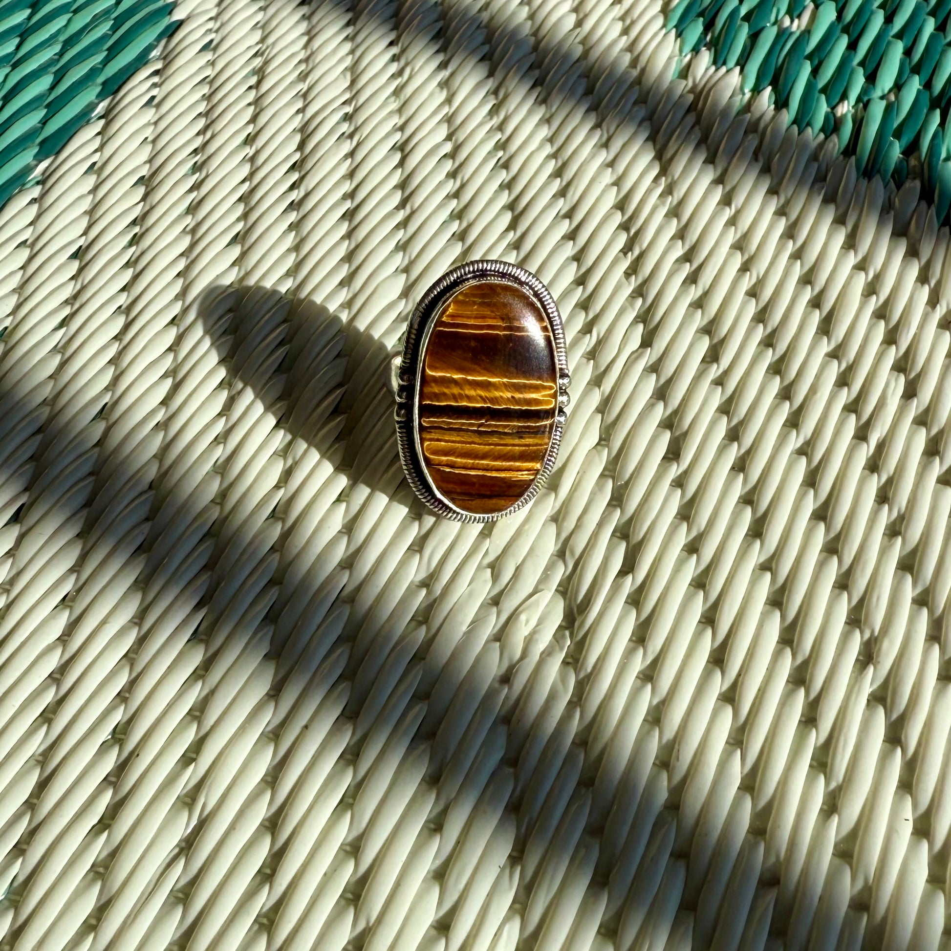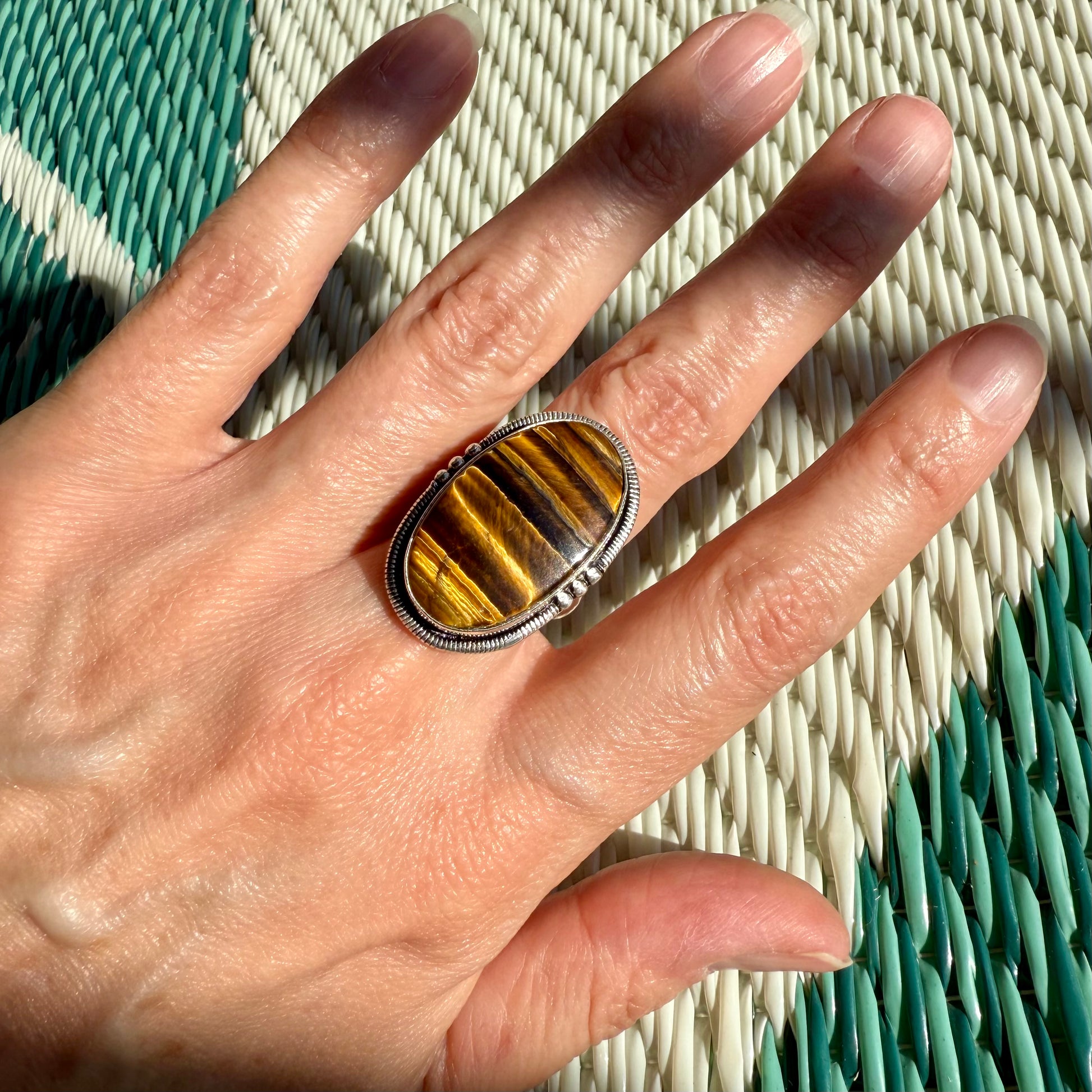 Vintage sterling silver ring featuring a large oval tiger's eye cabochon with rich golden-brown chatoyant banding. This is a fun, bold piece!