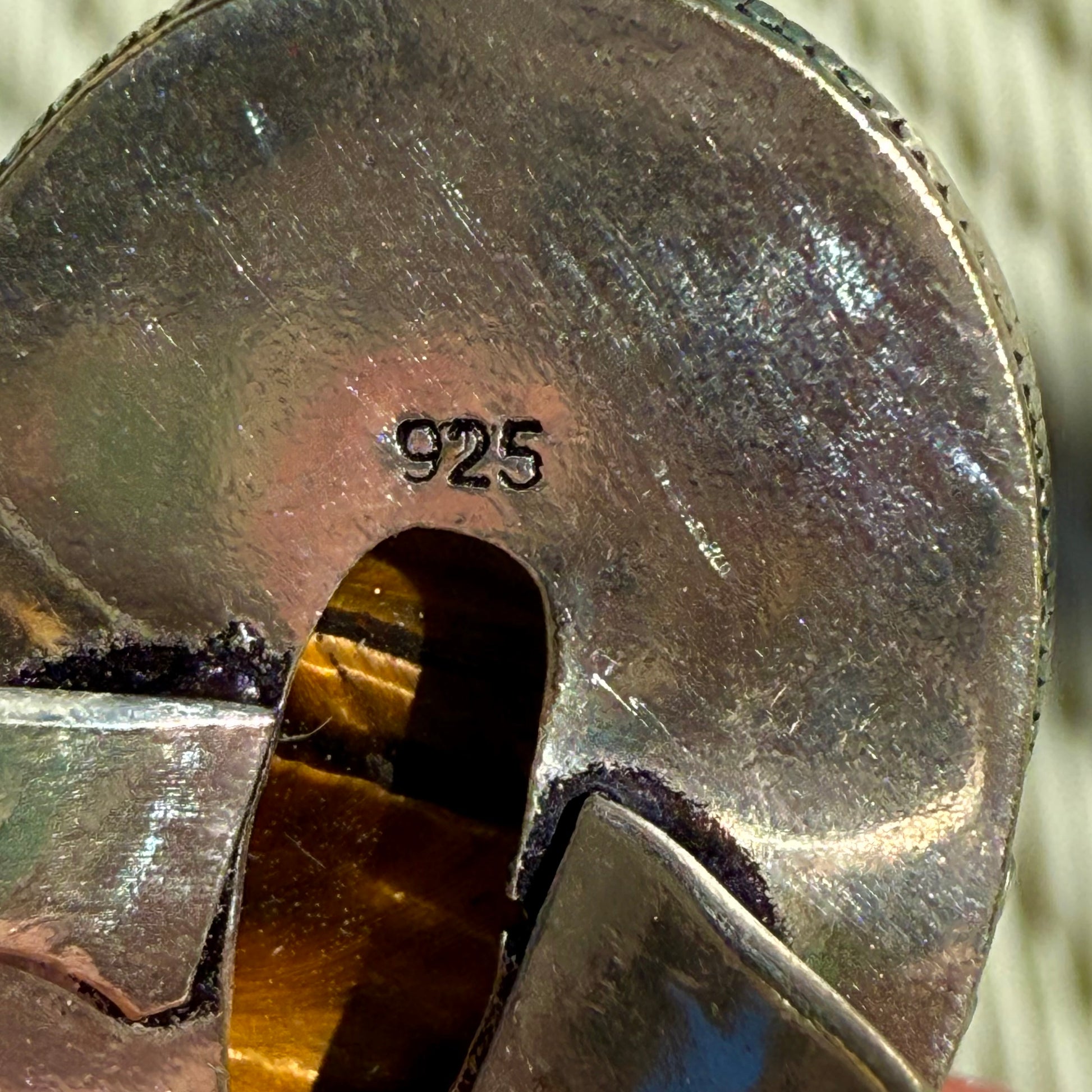 The substantial tiger's eye displays excellent chatoyancy with distinctive parallel bands in warm honey and amber tones. Set in sterling silver with decorative rope-style bezel detailing. Substantial weight and presence.